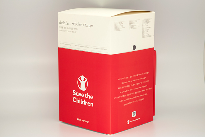 ‘에이프릴스톤 착한 선풍기’는 편리한 기능과 감성적 디자인을 갖춘 무선충전 탁상용 선풍기와 함께, 올해로 창립 101주년을 맞이한 국제 구호개발 NGO 세이브더칠드런의 기념 스티커와 휴대폰 스트랩을 담아 포장했다. 판매 대수당 1천원을 세이브더칠드런에 전달하게 되며, 이는 국내 저소득 조부모가정 아동들의 교육을 위한 IT 기기 구매 및 교육지원 용도로 사용될 예정이다.