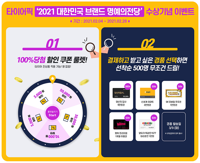 이번 이벤트는 지난달 산업정책연구원이 주최한 ‘2021 대한민국 브랜드 명예의전당’에서 타이어픽이 타이어전문점 부문 1위 브랜드로 선정된 데 따른 것으로, 타이어픽이 수상할 수 있도록 큰 관심과 애정을 보여준 고객들에게 감사를 전한다는 마음으로 기획했다.