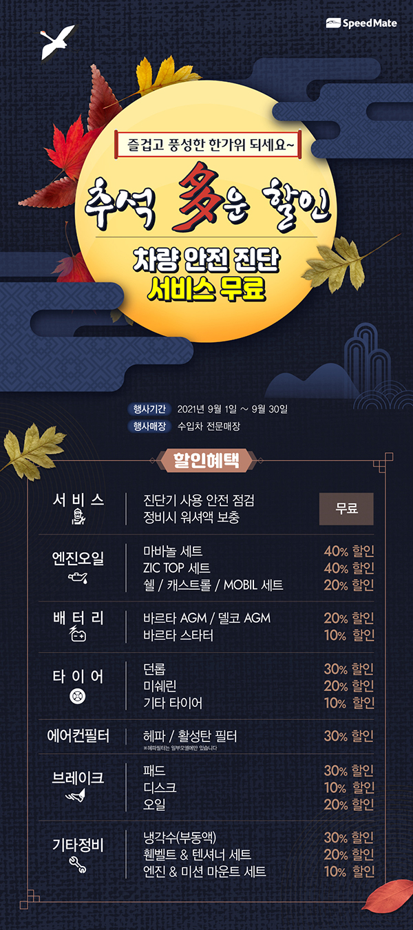 자동차 종합 관리 브랜드 ‘스피드메이트’가 한가위를 맞아 수입차 운전 고객들의 안전하고 행복한 귀성길을 돕는다.