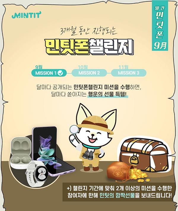 [사진 설명 2] 월간 민팃폰과 함께 고객 참여 확대를 위해 운영하고 있는 ‘민팃폰챌리지’ 이벤트 안내 이미지. 11월까지 폴더폰 대상 이벤트를 실시하며, 모든 폴더폰 기종으로 행사에 참여할 수 있다. 9월은 이벤트 참여 고객 중 추첨을 통해 갤럭시 Z 플립3(3명), 갤럭시 워치4(1명), 갤럭시 버즈2(1명)를 선물한다.