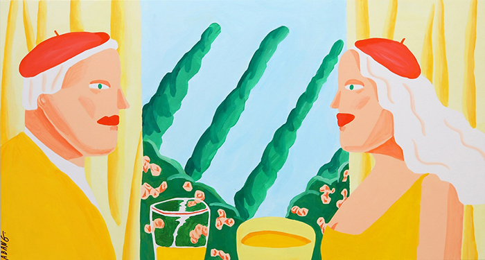 이번 전시에서 공개되는 아방의 신작 ‘호텔 카페의 연인’은 호텔 안에서 휴식을 취하는 연인을 볼 수 있다. 해외여행이나 휴양지를 찾지 못하는 요즘, 도심 속으로 ‘호캉스’를 떠나는 사람들의 모습과도 맞닿아 있다. 또한 작품 ‘Home party’는 집에서 사람들과 시간을 보내는 ‘집콕’의 풍경을 보는 듯하다.