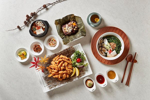 [사진설명 2] 워커힐 호텔앤리조트가 세현CC 클럽하우스에서 선보이는 친환경 가을 메뉴 ‘연잎 밥상’, ‘닭 연골 튀김’, ‘백합 보리새우 아욱국’