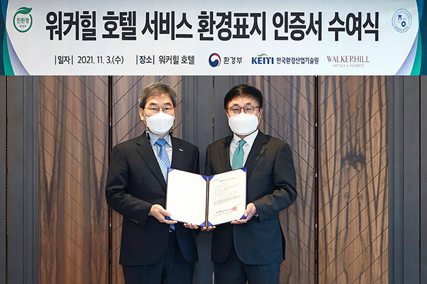 [사진설명 2] 3일 ‘워커힐 호텔 서비스 환경표지 인증서 수여식’에 참석한 한국환경산업기술원 김종환 본부장(좌)이
