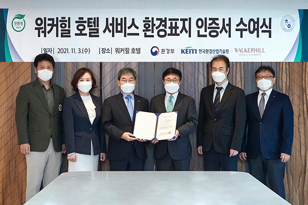 11월 3일(수) 그랜드 워커힐에서는 이번 인증 취득을 기념하는 ‘워커힐 호텔 서비스 환경표지 인증서 수여식’이 열렸다. 이 날 행사에는 워커힐 호텔앤리조트 현몽주 총괄과 황은미 총지배인을 비롯해 한국환경산업기술원 김종환 본부장, 석승우 처장 등 관계자가 참석하여 ‘환경 표지’ 인증서를 수여하고 국내 호텔 업계의 인증 취득을 확대하는 방안을 논의했다.