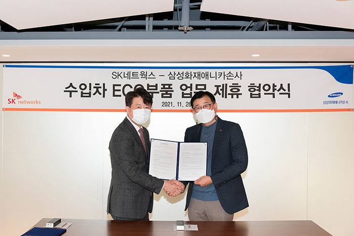 SK네트웍스는 서울 종로구에 위치한 삼일빌딩 본사에서 삼성화재애니카손사와 ‘수입차 ECO 부품 공급’ 업무 협약을 맺고, 앞으로 자동차 부품 자원 순환 사업을 추진한다고 26일 밝혔다.