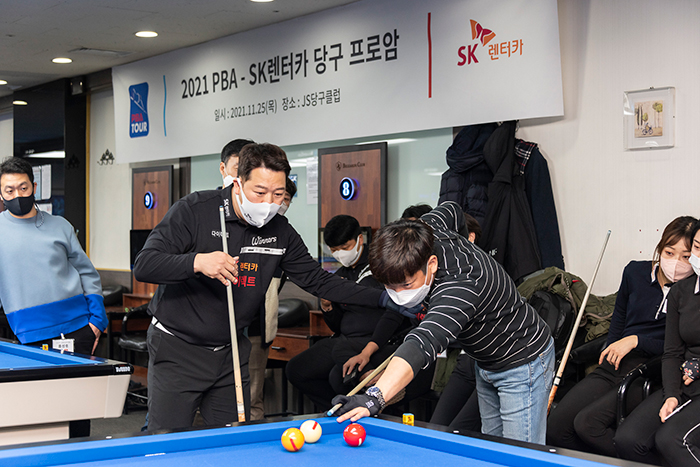 [사진 설명 2] 이장희 SK렌터카 위너스 팀 부단장이 행사 참여 고객에게 당구 강의를 진행하고 있다.