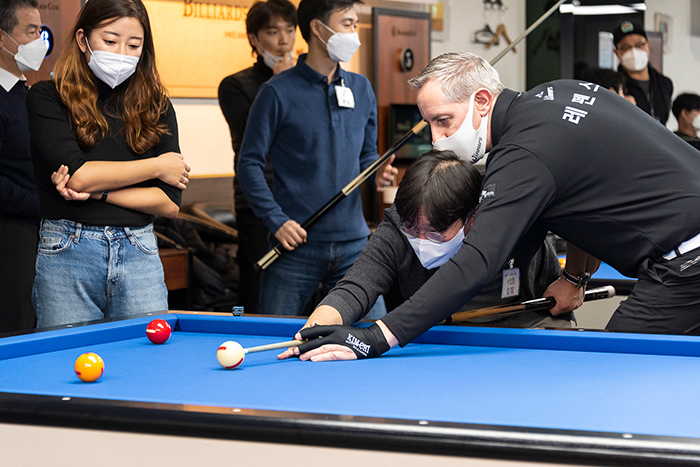 [사진 설명 3] 강동궁 선수의 예술구를 참여 고객이 직접 따라해 보고 있다.