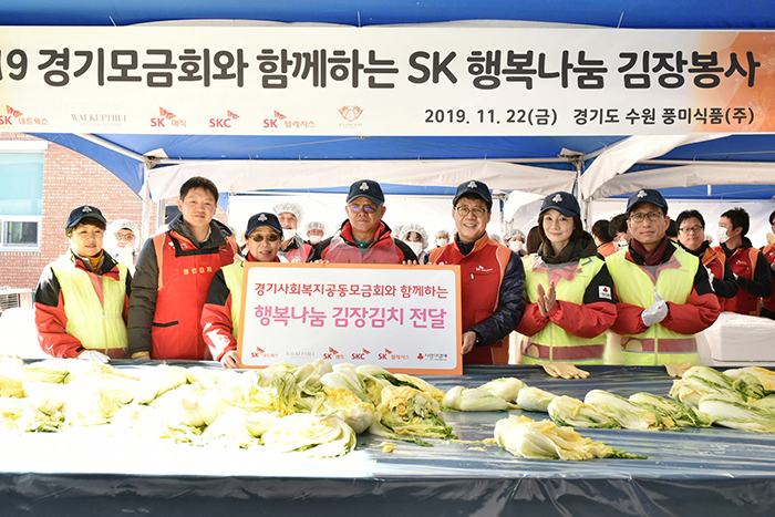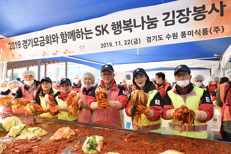 [사진 설명 2] 최신원 SK네트웍스 회장을 비롯한 SK네트웍스, SKC 등 관계사 구성원 220명은 22일 경기도 수원에서 ’2019 행복나눔 김장 봉사’를 실시하고 8천 5백 포기의 김장김치를 담가 서울, 경기 지역 이웃들에게 전달했다.