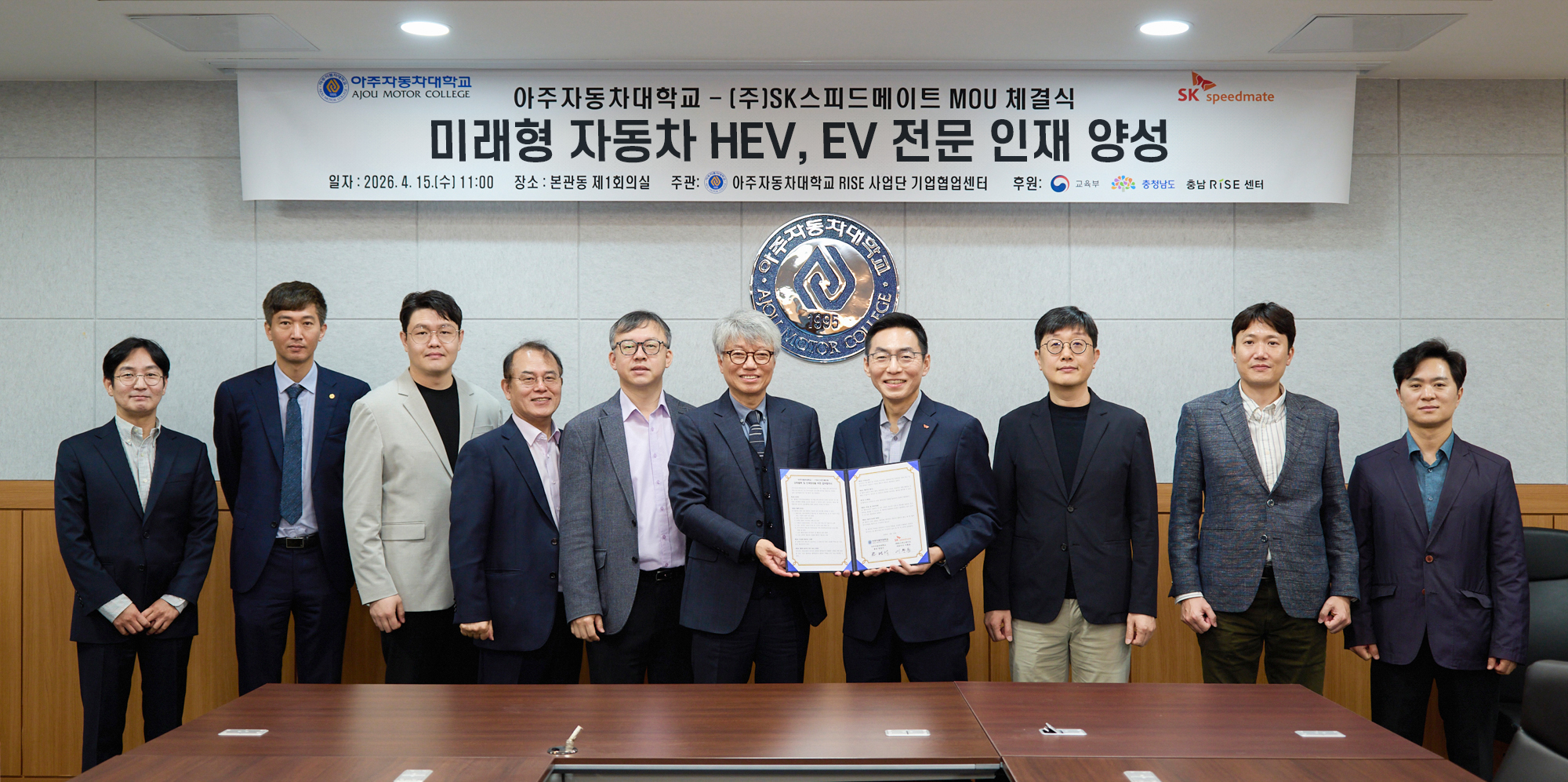 [사진 2] SK스피드메이트와 아주자동차대학교 주요 관계자들이 업무협약식에서 기념촬영하는 모습.