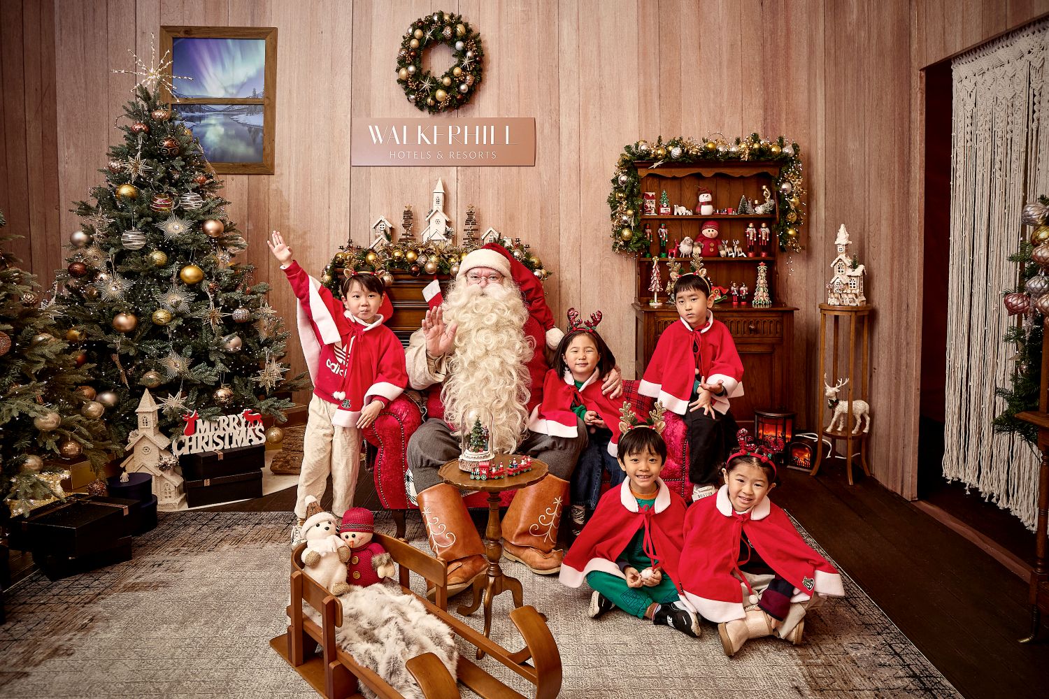 산타와 어린이들이 산타 캐빈에서 함께 기념 촬영을 하고 있다. = 워커힐 호텔앤리조트 제공