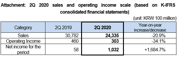 SK networks announced on July 30th, 2020 through its provisional performance disclosure that it achieved KRW 2.43 trillion in sales and KRW 30.3 billion in operating income for 2Q 2020 based on consolidated financial statements. Sales and operating income decreased by 20.9% and 34.1%, respectively, based on a year-on-year comparison.