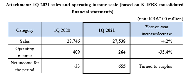 SK networks announced on May 4th, 2021 through a provisional performance disclosure that it achieved KRW 2.75 trillion in sales and KRW 26.4 billion in operating income (decreased by 4.2% and 35.4% respectively based on a year-on-year comparison) for 1Q 2021 based on consolidated financial statements. Its net income turned surplus with KRW 65.5 billion.