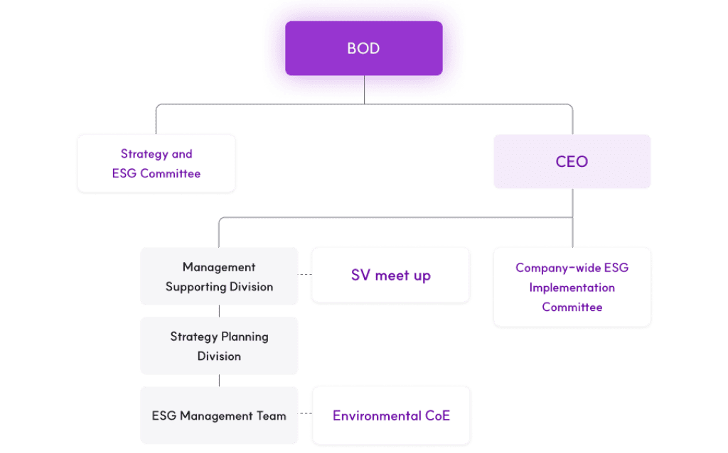 SK Networks operates a dedicated ESG Management Team to concentrate its company-wide capabilities on creating social value and securing communication channels for each business. The Board of Directors, as the highest decision-making body, deliberates on, decides, and supervises agenda items reviewed in advance by Strategy∙ESG Committee. Furthermore, ESG management is promoted through the Company-wide ESG Implementation Committee, which includes key executive, including the CEO.